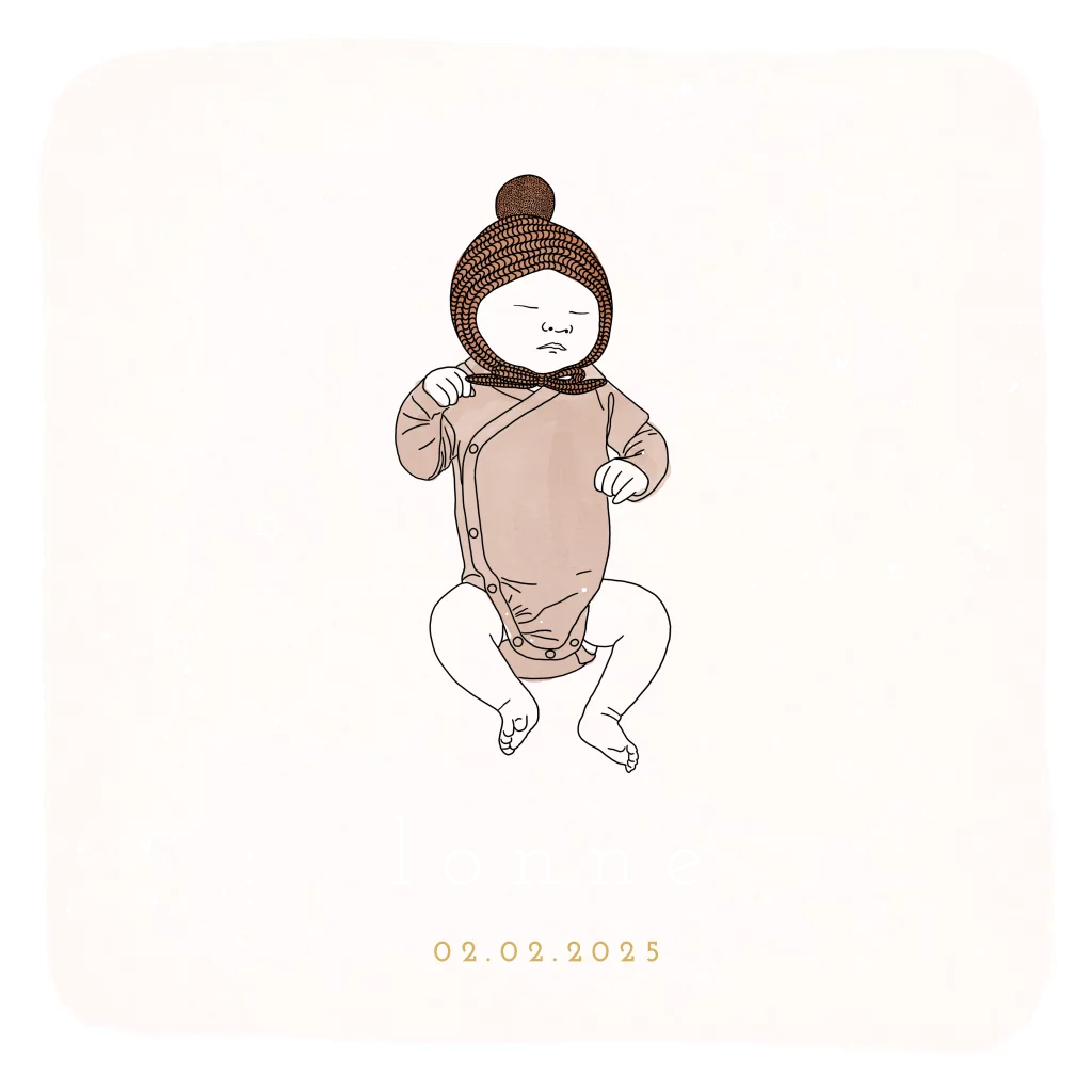 Geboortekaartje met goudfolie op de voor- en de achterkant van het kaartje, een lieve baby met mutsje op de voorkant van het kaartje, sterren, hartjes en spetters.