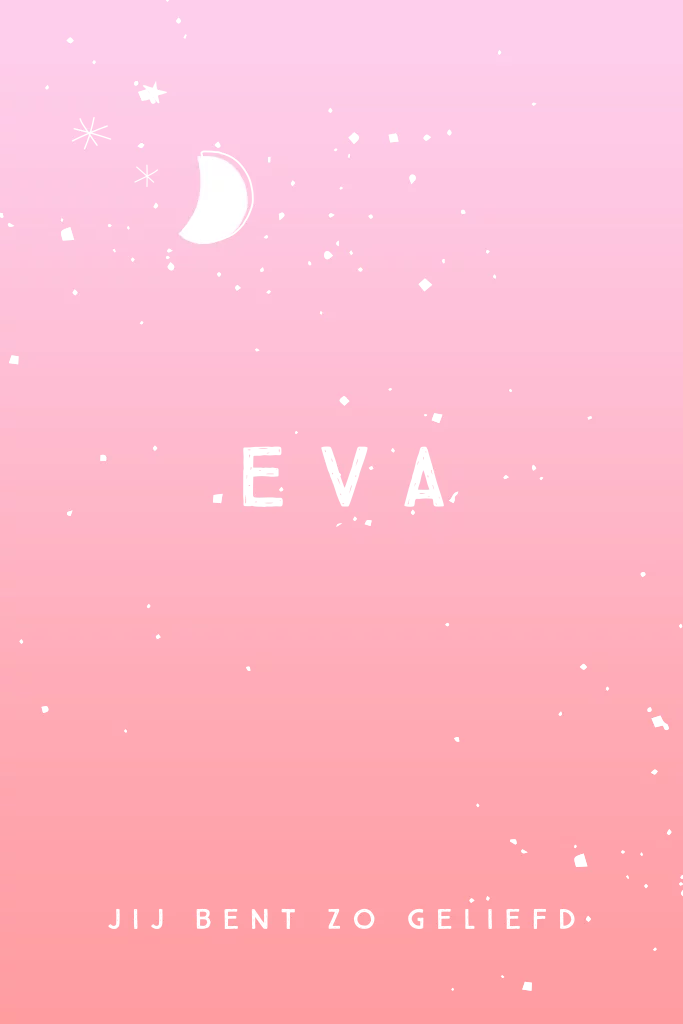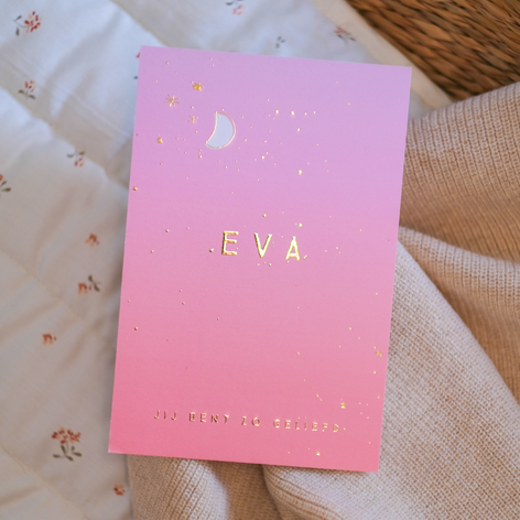 Geboortekaartje met roze achtergrond, maan, sterren en goudfolie