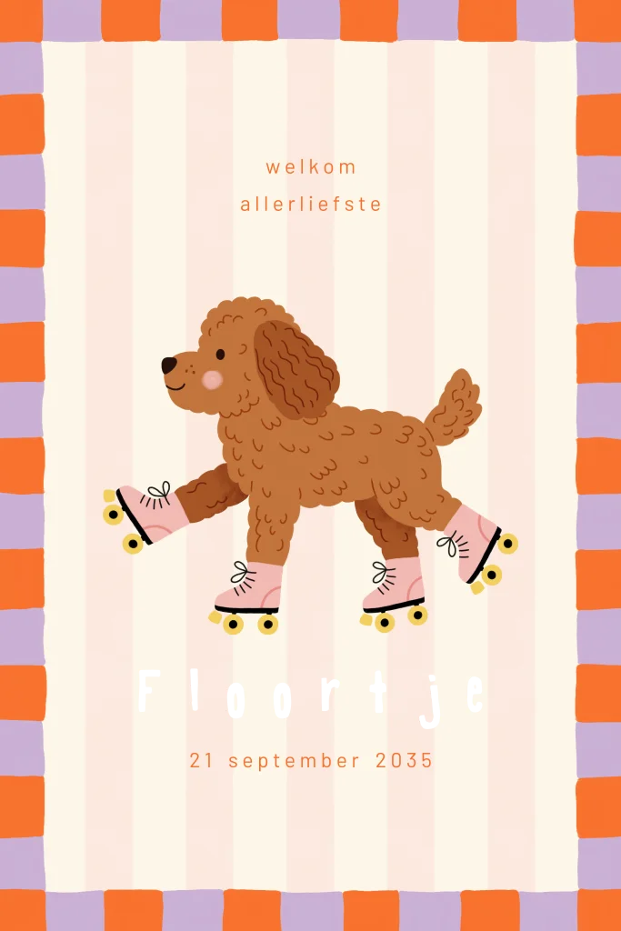 Vrolijk en kleurrijk geboortekaartje met een bruine rolschaatsende labradoodle.