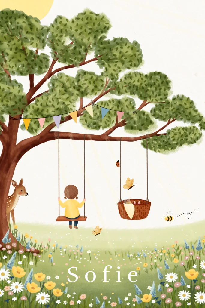 Op zoek naar een uniek geboortekaartje voor een lente kindje? Ontdek ons gestanste enkele geboortekaartje met een baby'tje in een schommelwiegje, een zus op een schommel ernaast, een hertje en lieve kleine dieren.