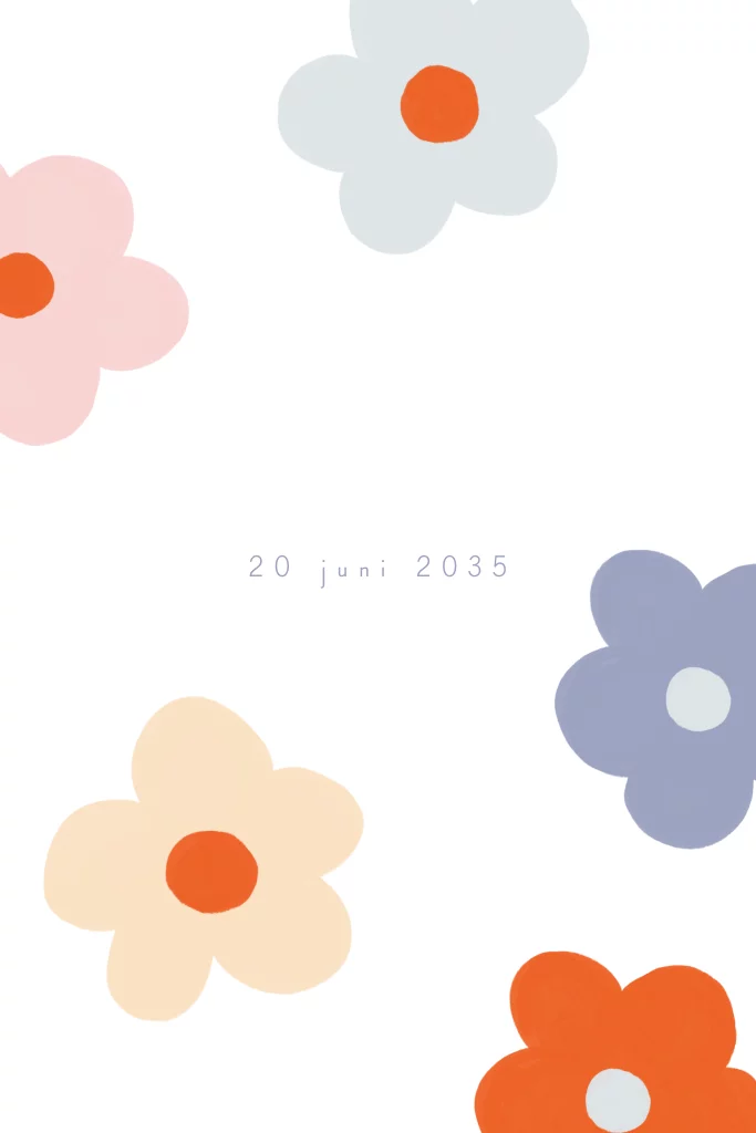 Vrolijk geboortekaartje met grote gekleurde bloemen.