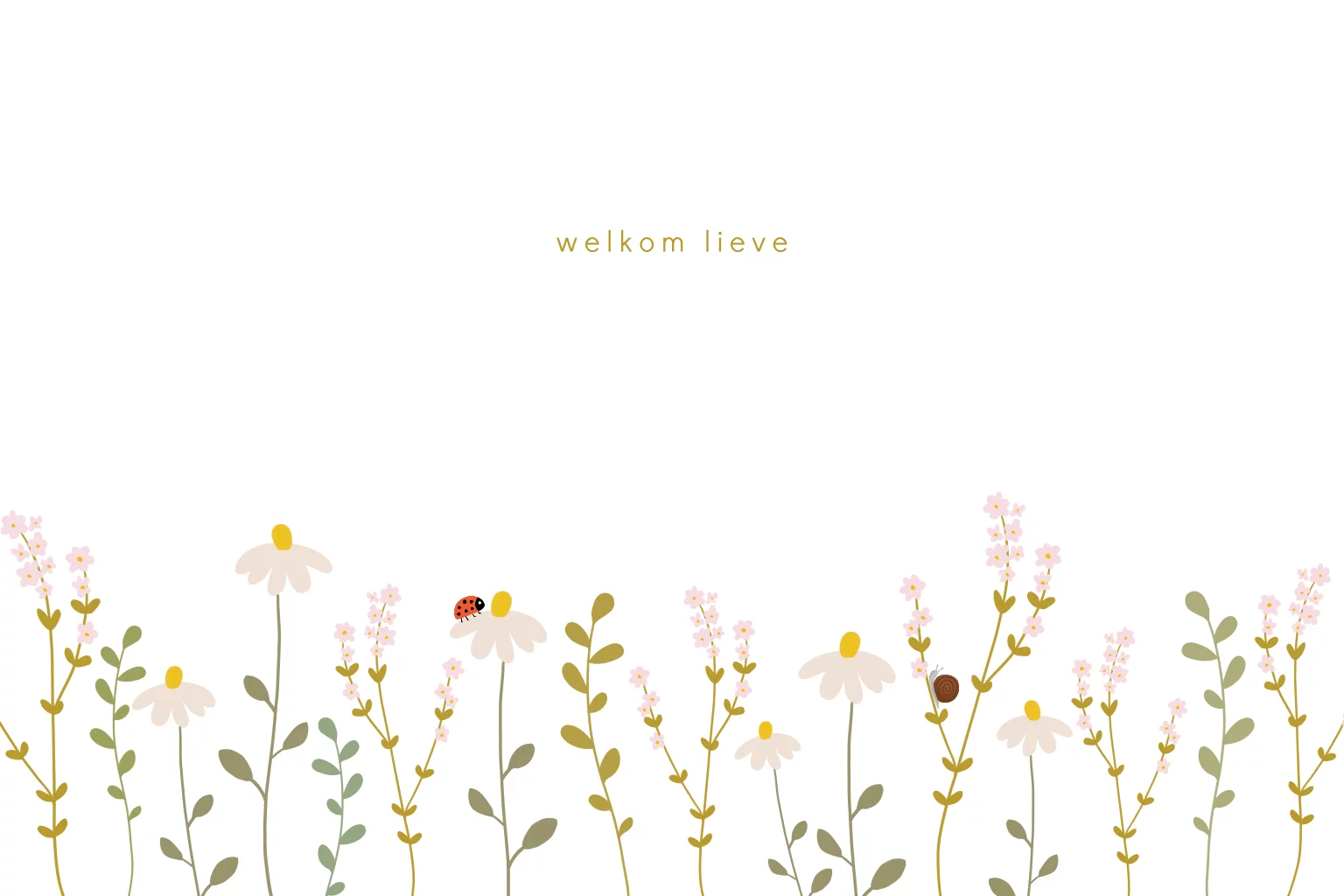 Vrolijk zomers geboortekaartje met bloemen, beestjes en goudfolie.