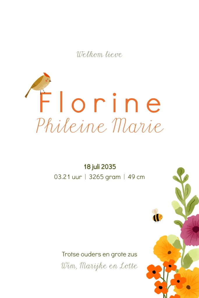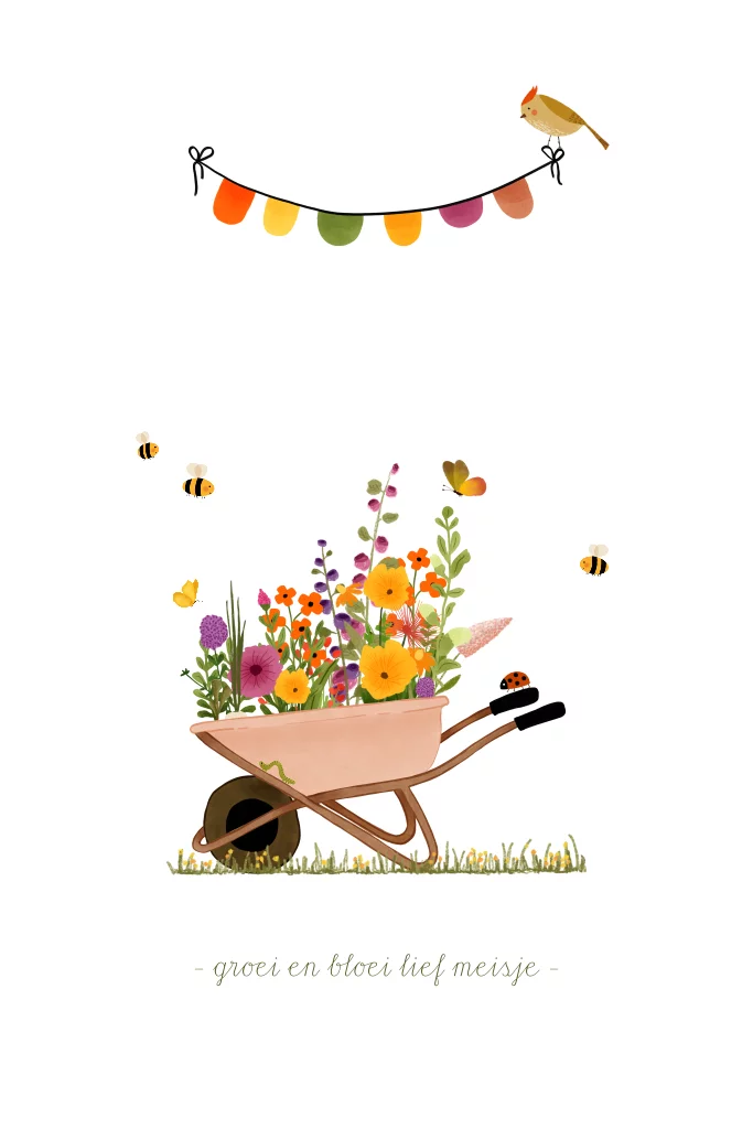 Dit unieke kaartje toont een kruiwagen vol met weelderige planten, kleurrijke bloemen, en schattige dieren. Van vlinders en lieveheersbeestjes tot bijtjes en een vogeltje, er is zoveel te ontdekken op dit vrolijke kaartje. De naam van jullie kindje schittert in prachtig goudfolie, waardoor het geheel een extra persoonlijk tintje krijgt.