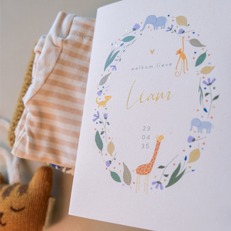Geboortekaartje met jungle dieren - een giraf, olifantjes, een aapje en een panter - blaadjes, bloemen en goudfolie.