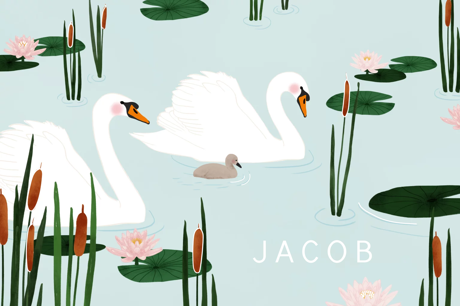 Op zoek naar een uniek liggend geboortekaartje met een betoverend ontwerp van zwanen, waterlelies en riet? Zoek niet verder! Dit prachtige kaartje straalt rust en elegantie uit en is perfect voor de aankondiging van de geboorte van jullie kindje. De sierlijke zwanen, weelderige waterlelies en rietstengels vormen een harmonieus geheel en creëren een sfeer van sereniteit en natuurlijke schoonheid.