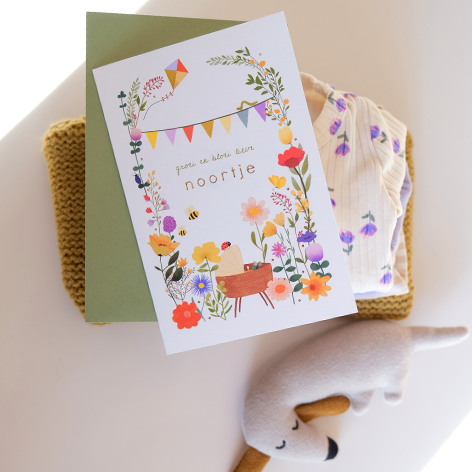 Vrolijk kleurrijk geboortekaartje, met bloemen, slingers, een wiegje, kleine dieren en goudfolie.