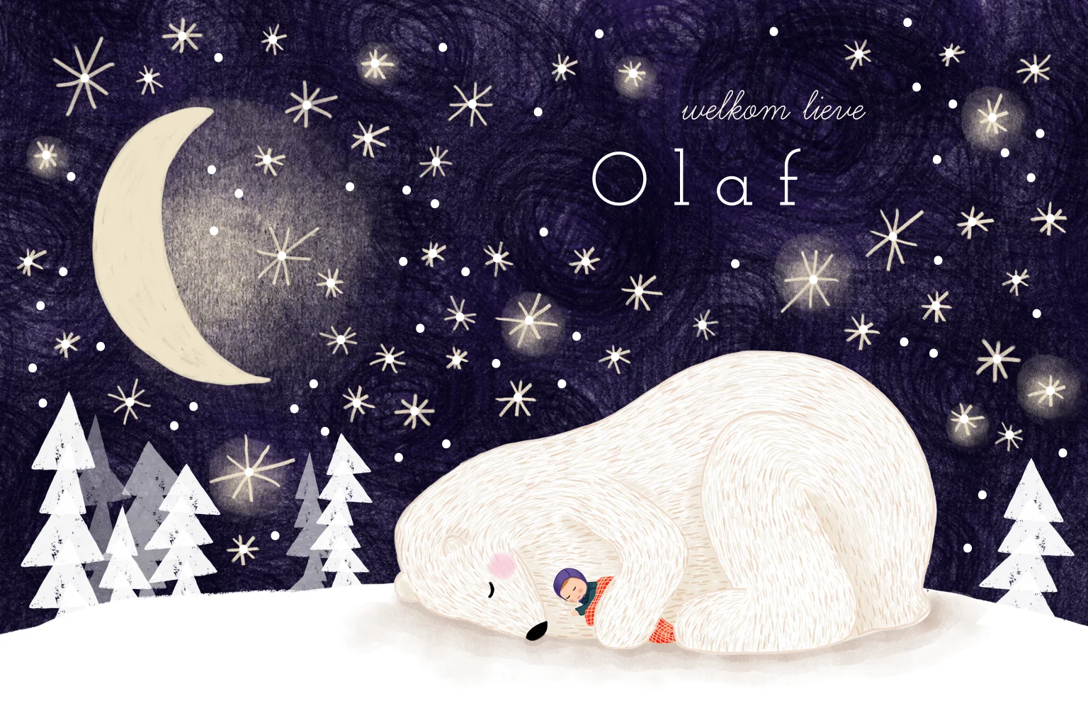 Winters geboortekaartje met een maan en sterrenhemel en grote vriendelijke ijsbeer en een slapend kindje onder een dekentje.