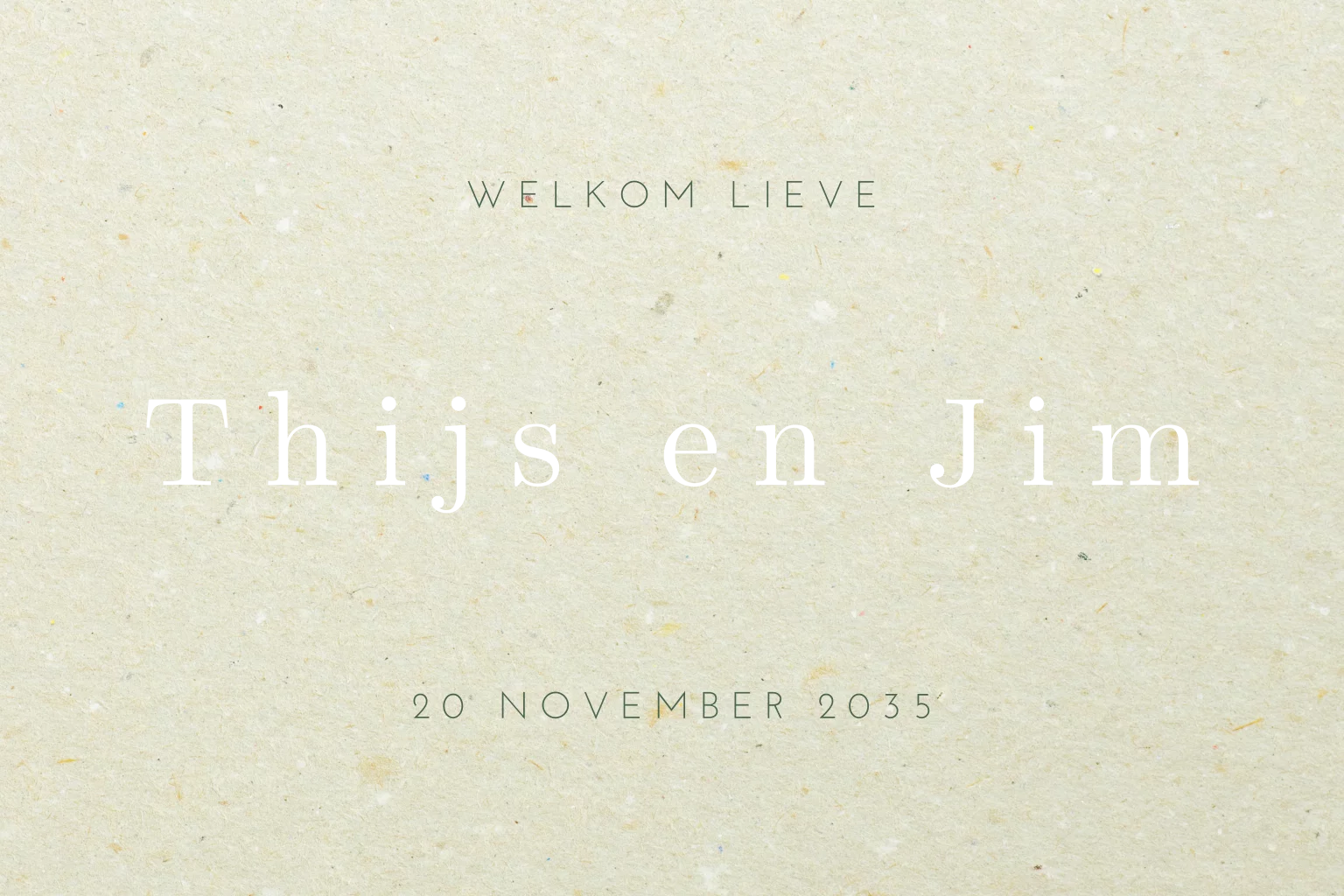 Stoer geboortekaartje voor een tweeling met de namen in goudfolie.