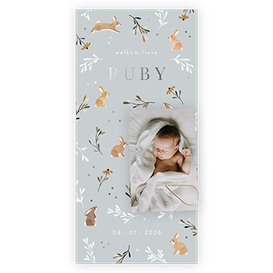 Label geboortekaartje met konijntjes, een los fotootje en zilverfolie