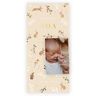 Label geboortekaartje met konijntjes, een los fotootje en goudfolie