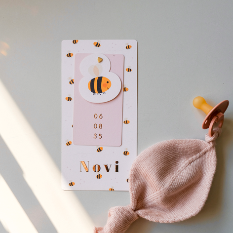 Tof label geboortekaartje met bijtjes en goudfolie.