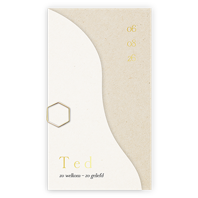 Label geboortekaartje met een kaartje in een golvende vorm, een karton-look achtergrond en goudfolie.