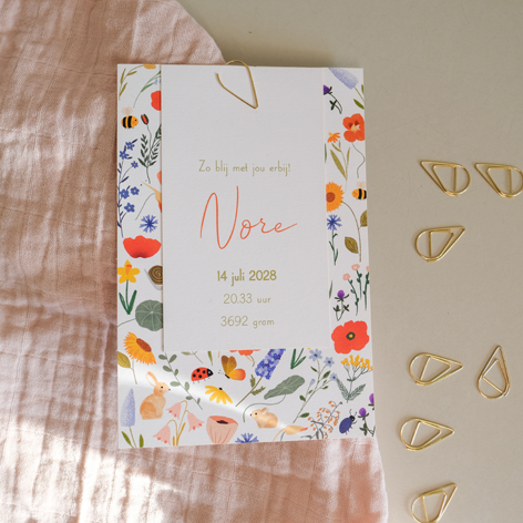 Label geboortekaartje met bloemen en kleine dieren.