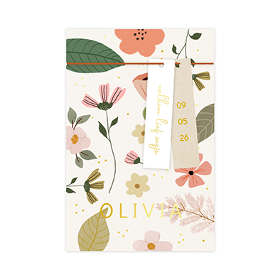 Label geboortekaartje met bloemen in roze kleuren en blaadjes.