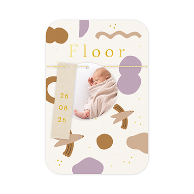 Label geboortekaartje vrolijke vormen, vogels, een fotootje van je dochter en goudfolie.