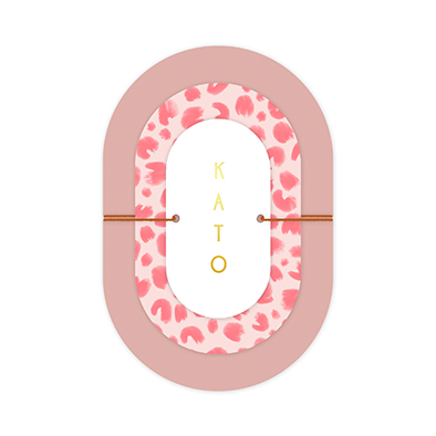 Roze label geboortekaartje met drie ovale vormen, een luipaard printje en goudfolie.