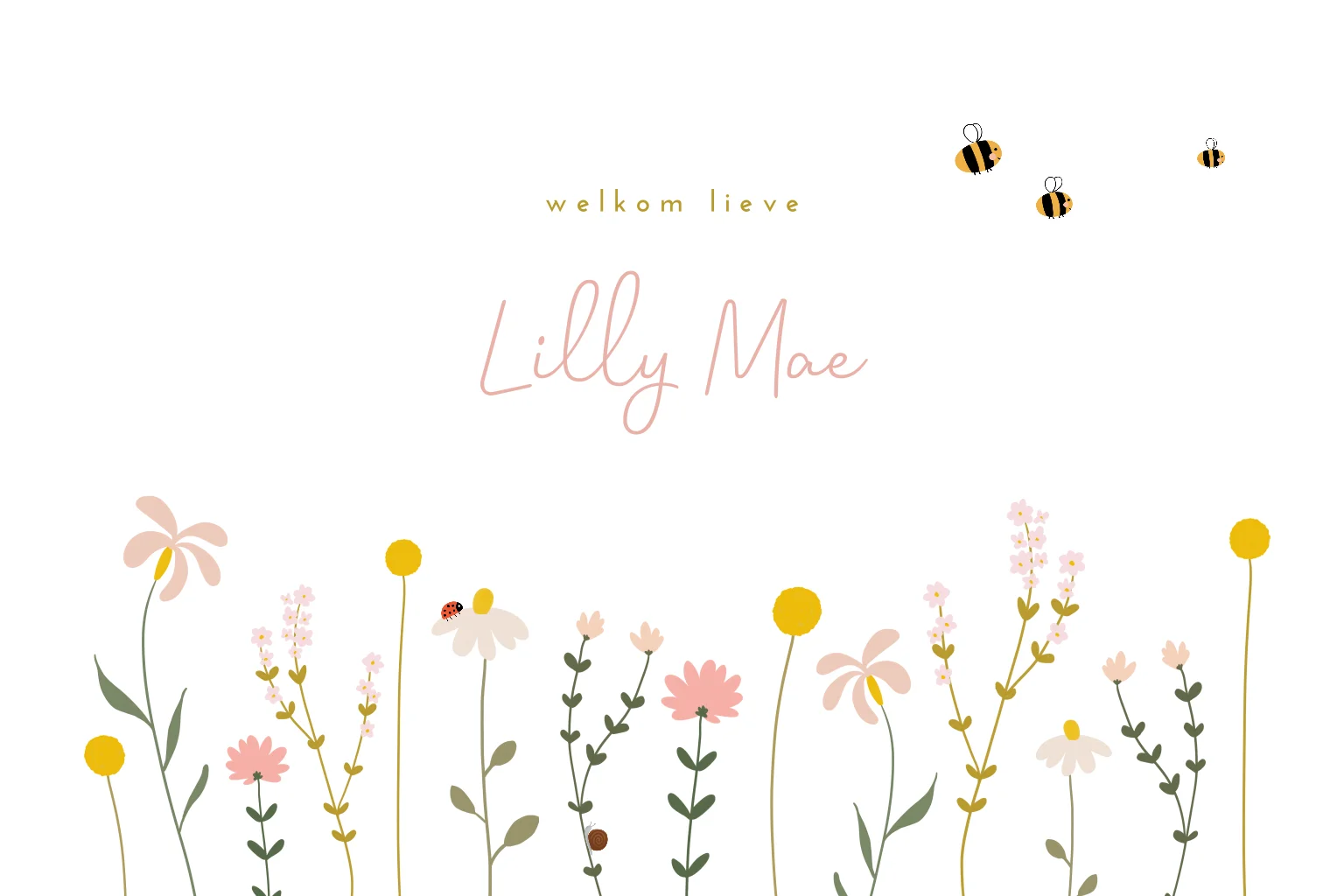 Geboortekaartje met bloemen, bijtjes, een slakje en lieveheersbeestje