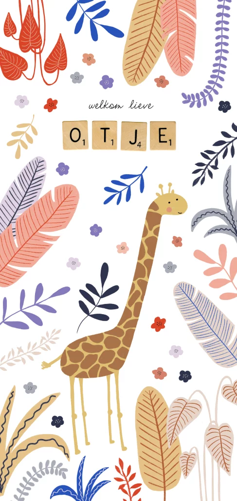 Vrolijk langwerpig jungle geboortekaartje met giraf, scrabble letters en ronde hoeken.