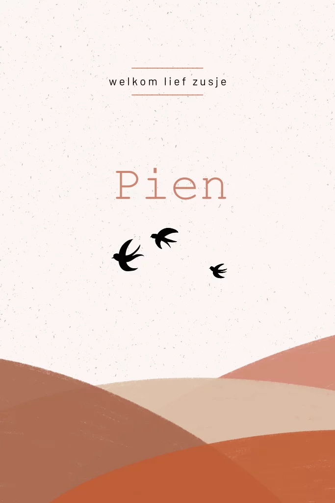 Geboortekaartje met ronde hoeken voor een zusje met heuvels en drie zwaluwen.