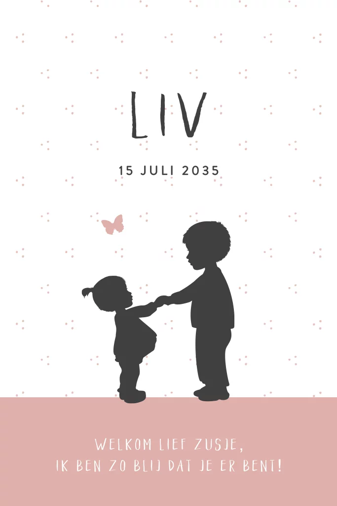 Lief silhouet geboortekaartje met een kleine zus, een grote broer en ronde hoeken.