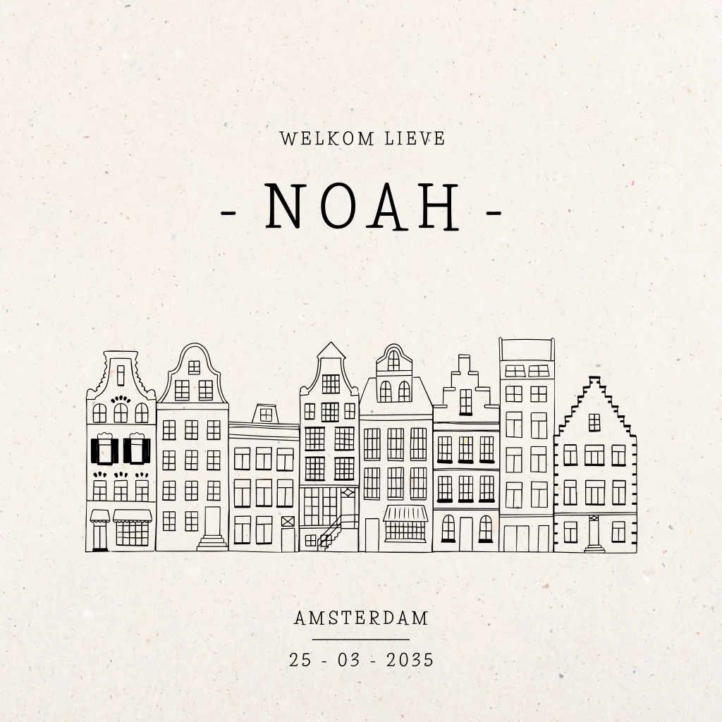Enkel vierkant geboortekaartje met ronde hoeken en zwarte bedrukking van Amsterdamse grachtenpandjes.