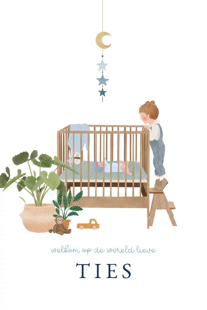 Dit schattige geboortekaartje toont een baby broertje in de box en zijn trotse grote zus ernaast, perfect om de komst van jullie nieuwe gezinslid te vieren. De tekening bevat ook speelse elementen zoals planten, een maan en sterrenhanger en knuffeltjes, waardoor het een lief en vrolijk geheel vormt.