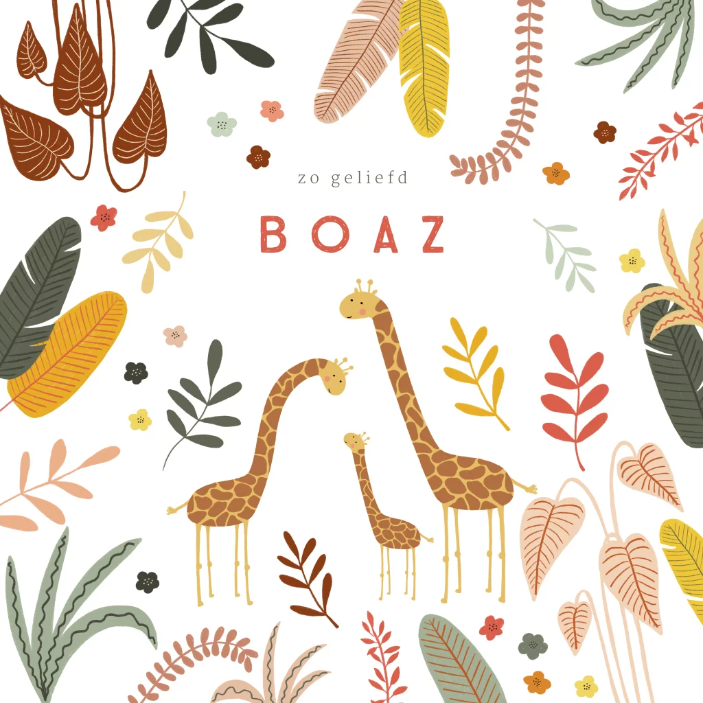Vrolijk geboortekaartje met giraffen, takjes, bloemen en blaadjes.