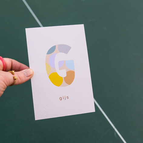 Geboortekaartje met een geïllustreerde letter. Super leuk zo'n initiaal van je kindje groot op de voorkant van het kaartje.