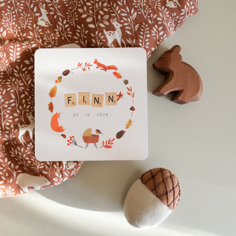 Dit prachtige geboortekaartje met een krans van herfstblaadjes, dieren en een wiegje is een unieke en sfeervolle manier om de komst van jouw kleine wonder aan te kondigen. Het kaartje is gedecoreerd met herfstblaadjes, een schattig vosje, slakje, vogeltje, vlinder, lieveheersbeestje en eekhoorntjes, omringd door een lieflijk wiegje. De naam van jullie kindje wordt op het kaartje weergegeven in charmante scrabble-letters, met de mogelijkheid tot andere lettertypes uit onze beeldbank. De warme kleuren bruin en oranje geven dit kaartje een knusse uitstraling die perfect past bij het herfstseizoen.