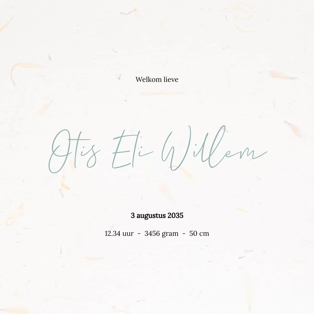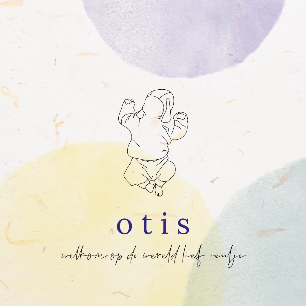 Lief vierkant geboortekaartje met een een lijntekening van een baby en gekleurde bollen tegen een bloemblaadjes papier-look achtergrond.