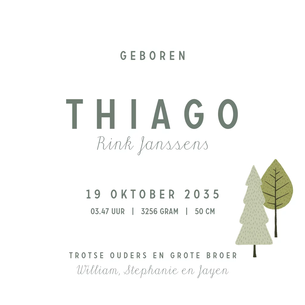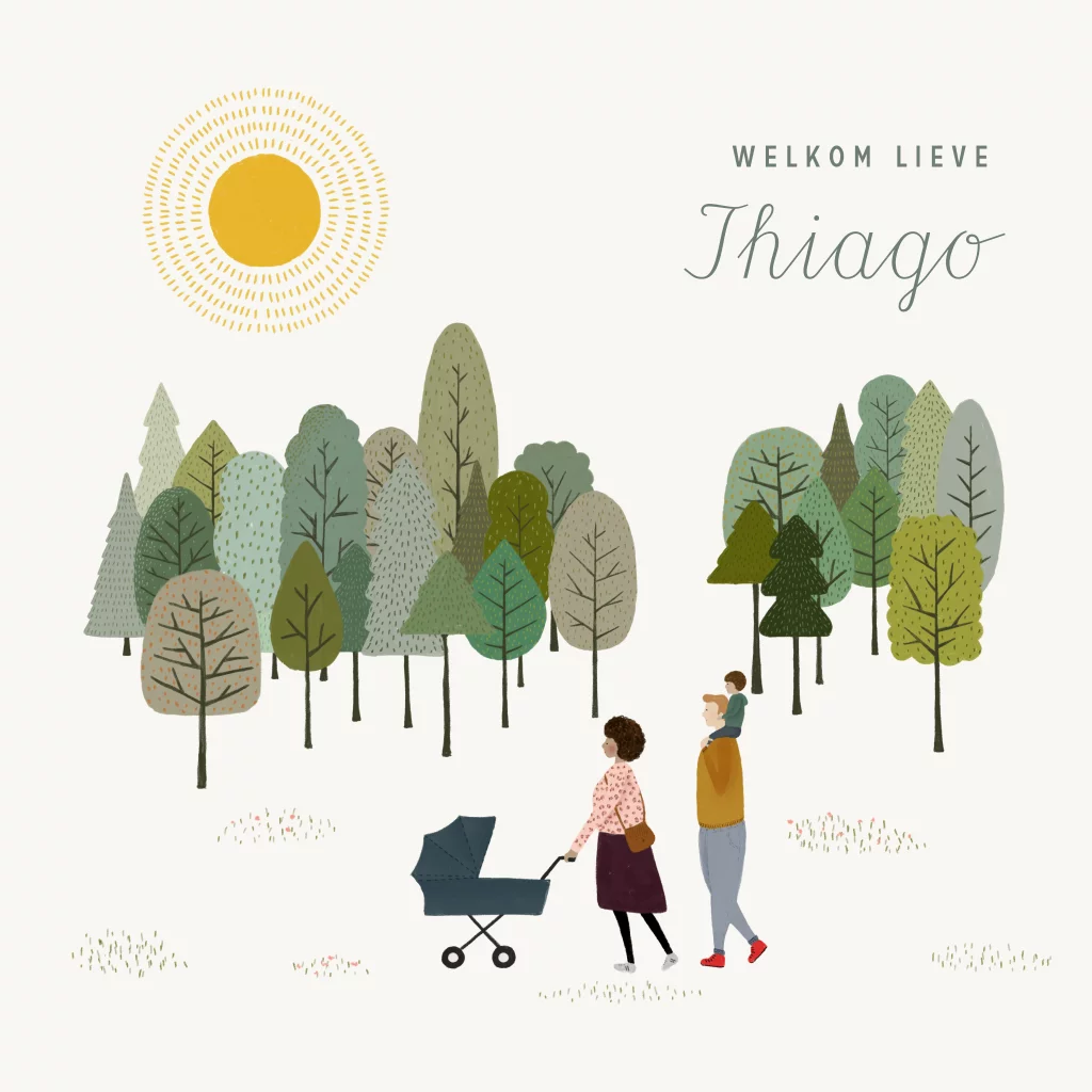 Vierkant geboortekaartje met bomen, zon, ouders, grote broer en de baby in de kinderwagen.