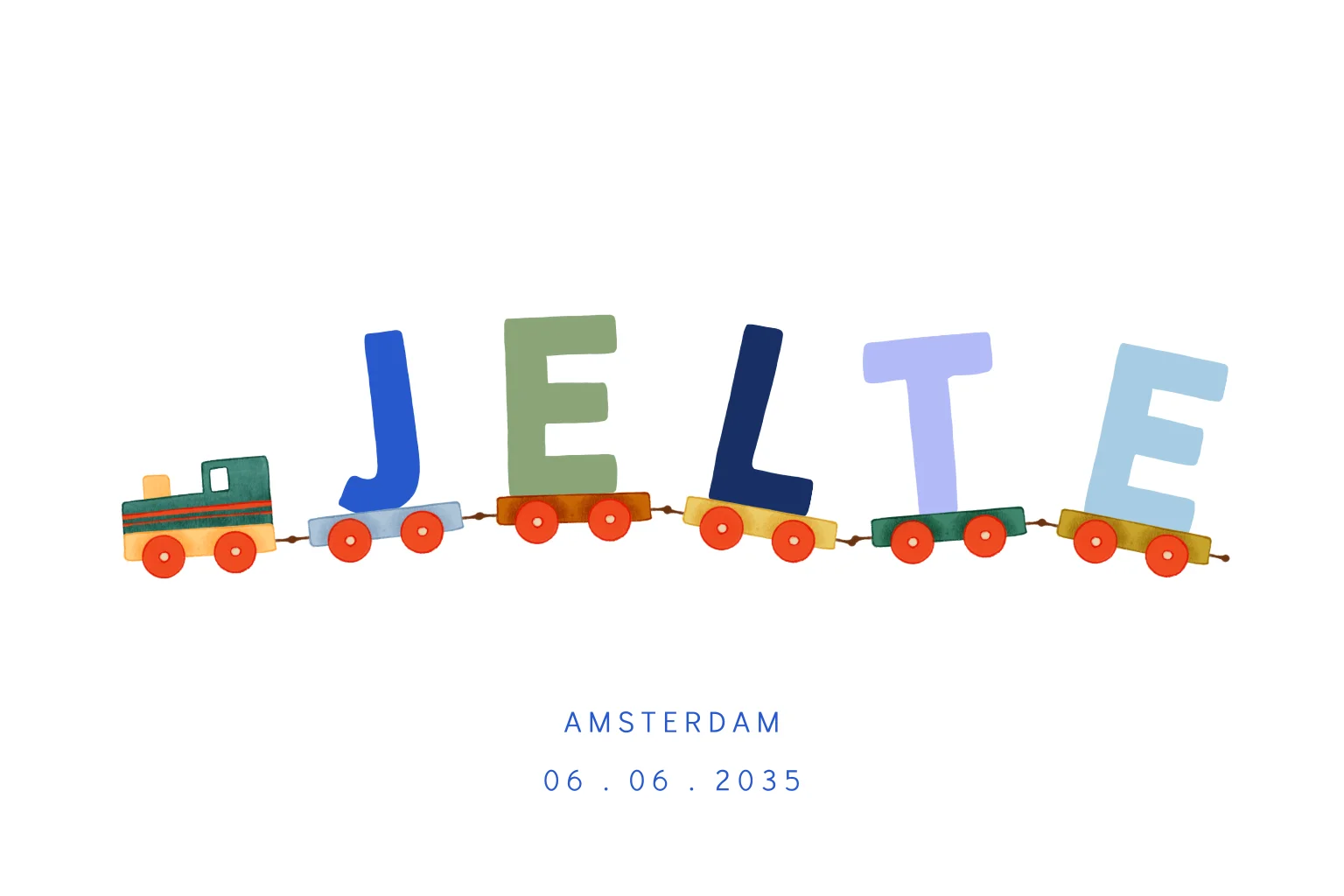 Geboortekaartje met een treintje waar de letters van de naam van jullie kindje op staan.
