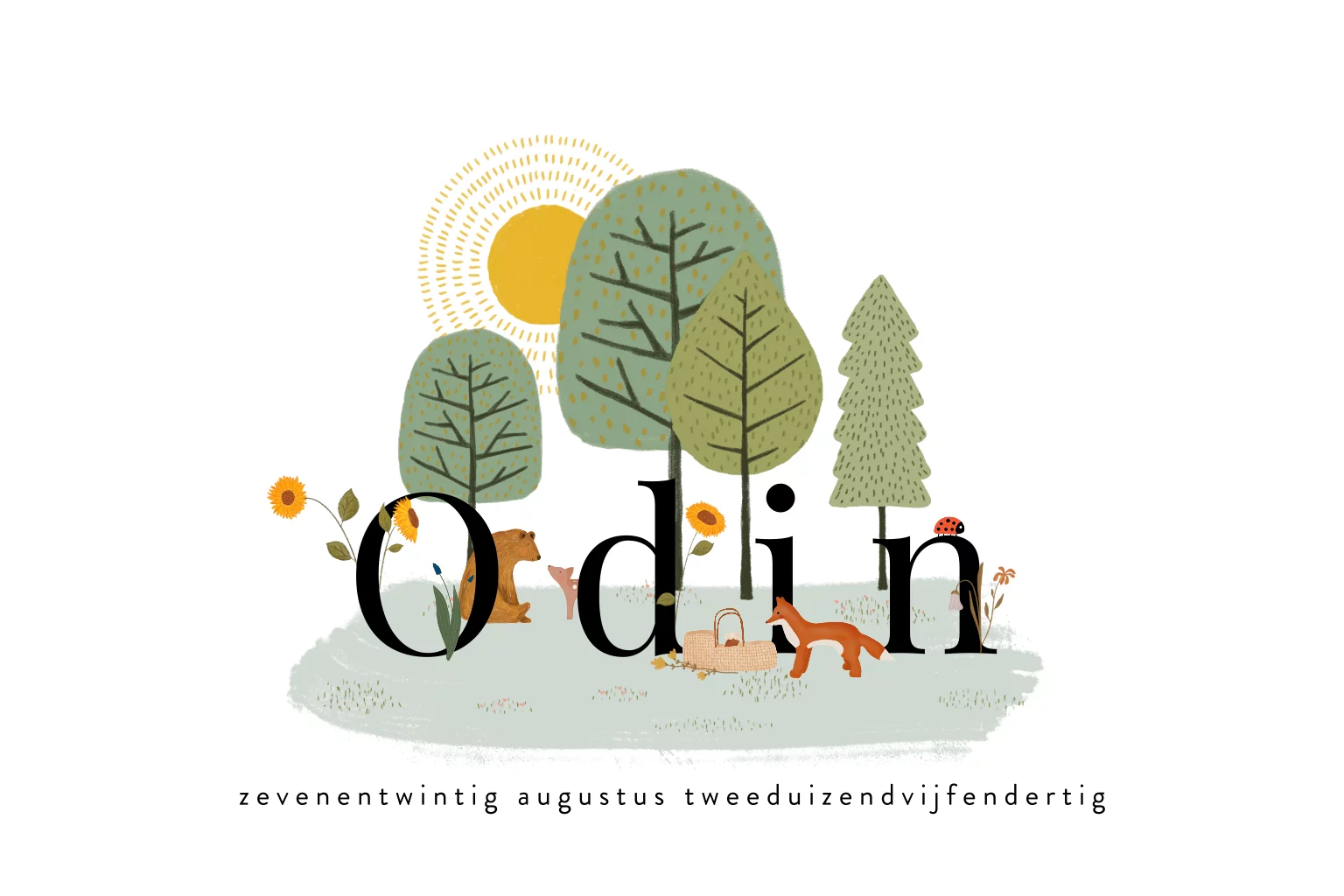 Geboortekaartje met om de naam van je kindje heen bomen, bloemen, de zon, dieren en een babymandje.