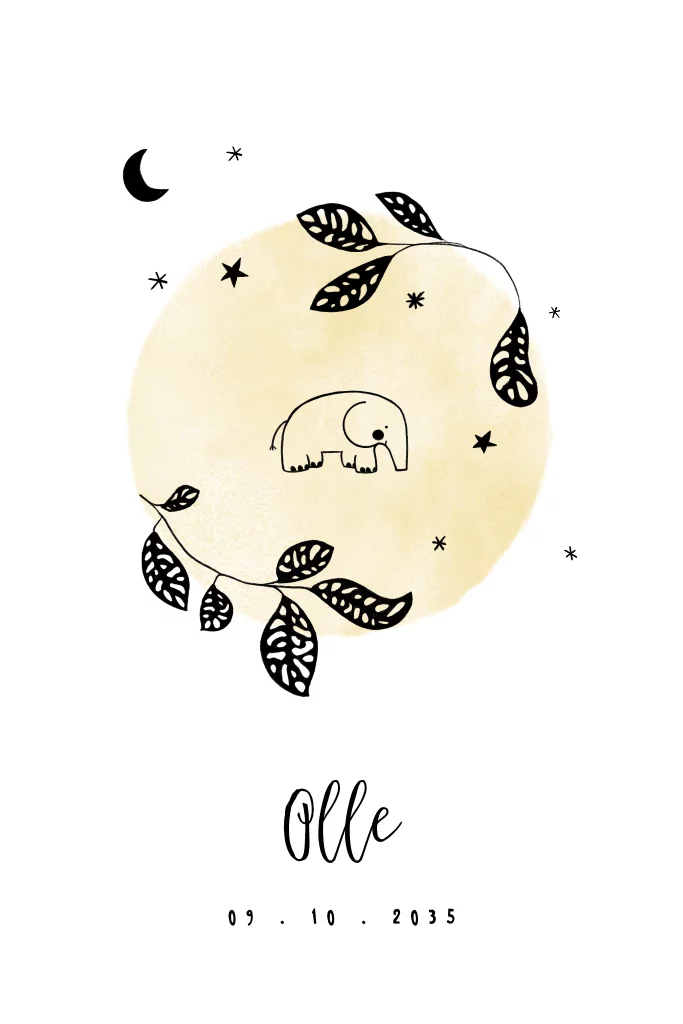 Geboortekaartje met een olifantje, blaadjes, de maan en sterren