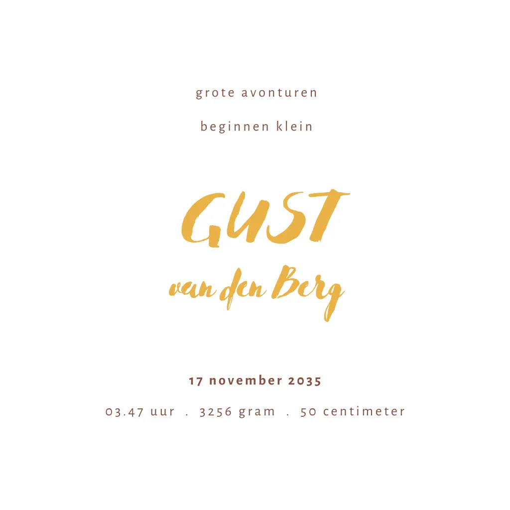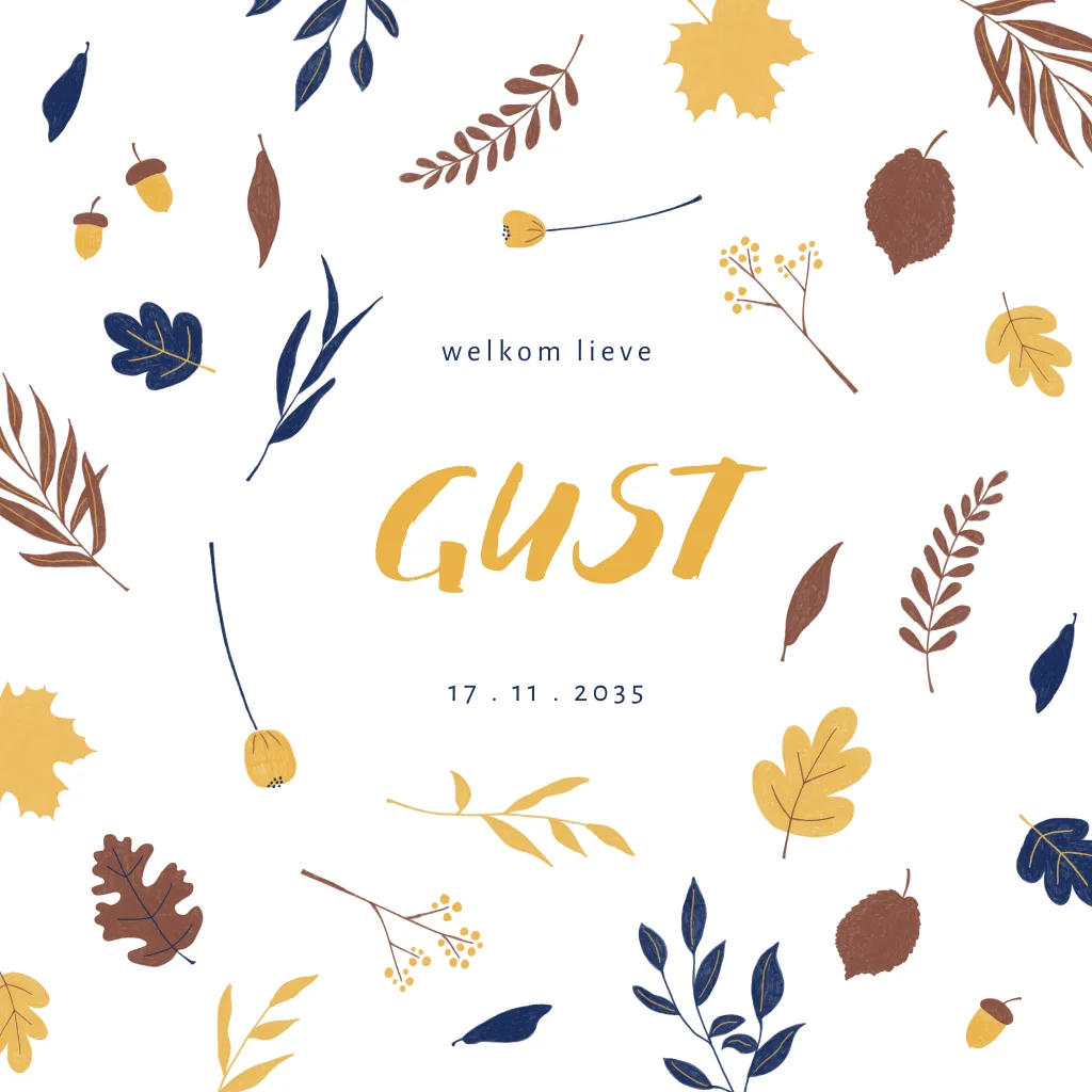 Getekend geboortekaartje met blaadjes en eikeltjes voor een herfstkindje.