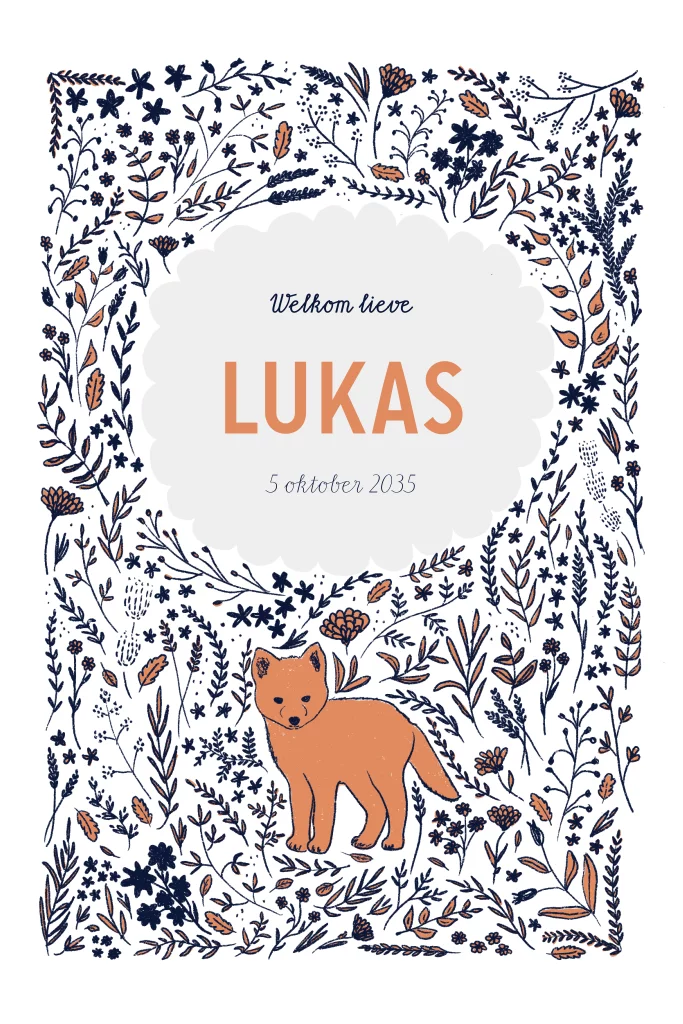 Handgetekend geboortekaartje met een vosje, takjes en blaadjes.