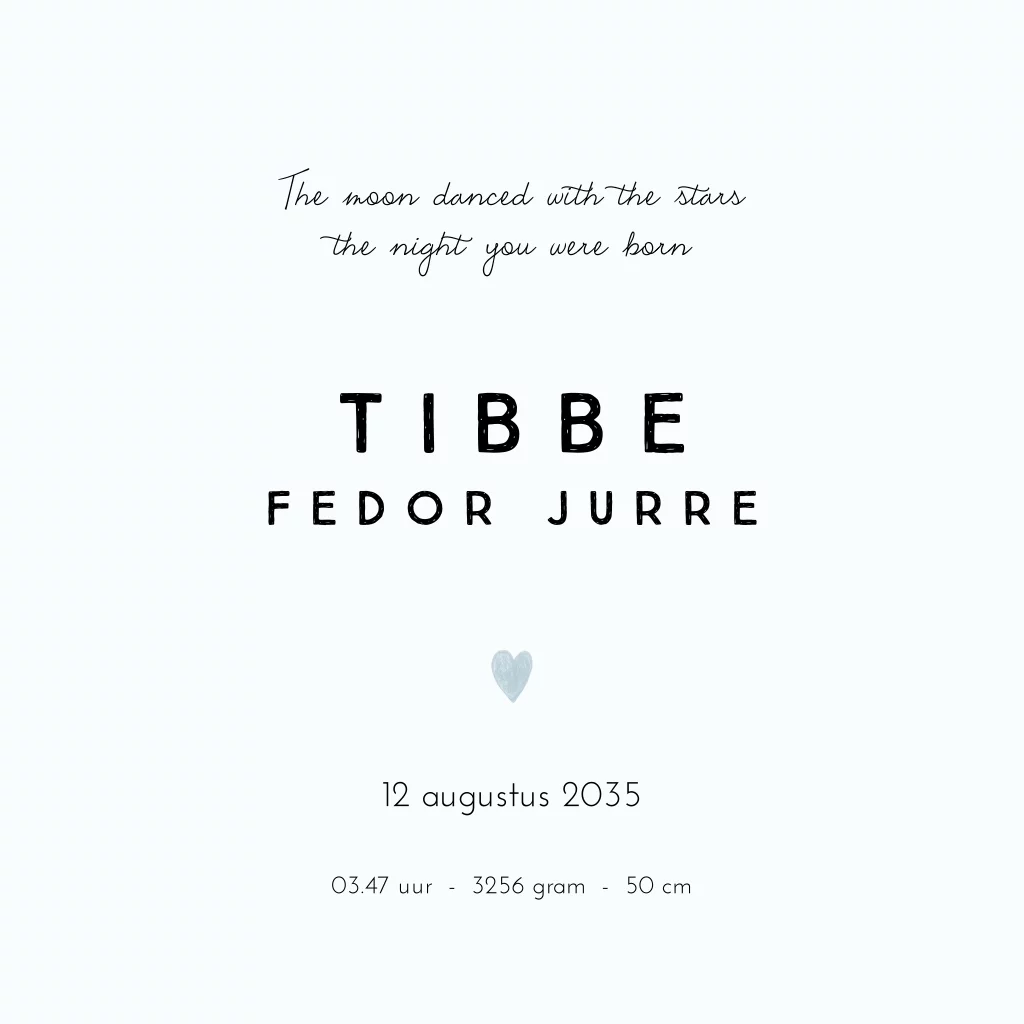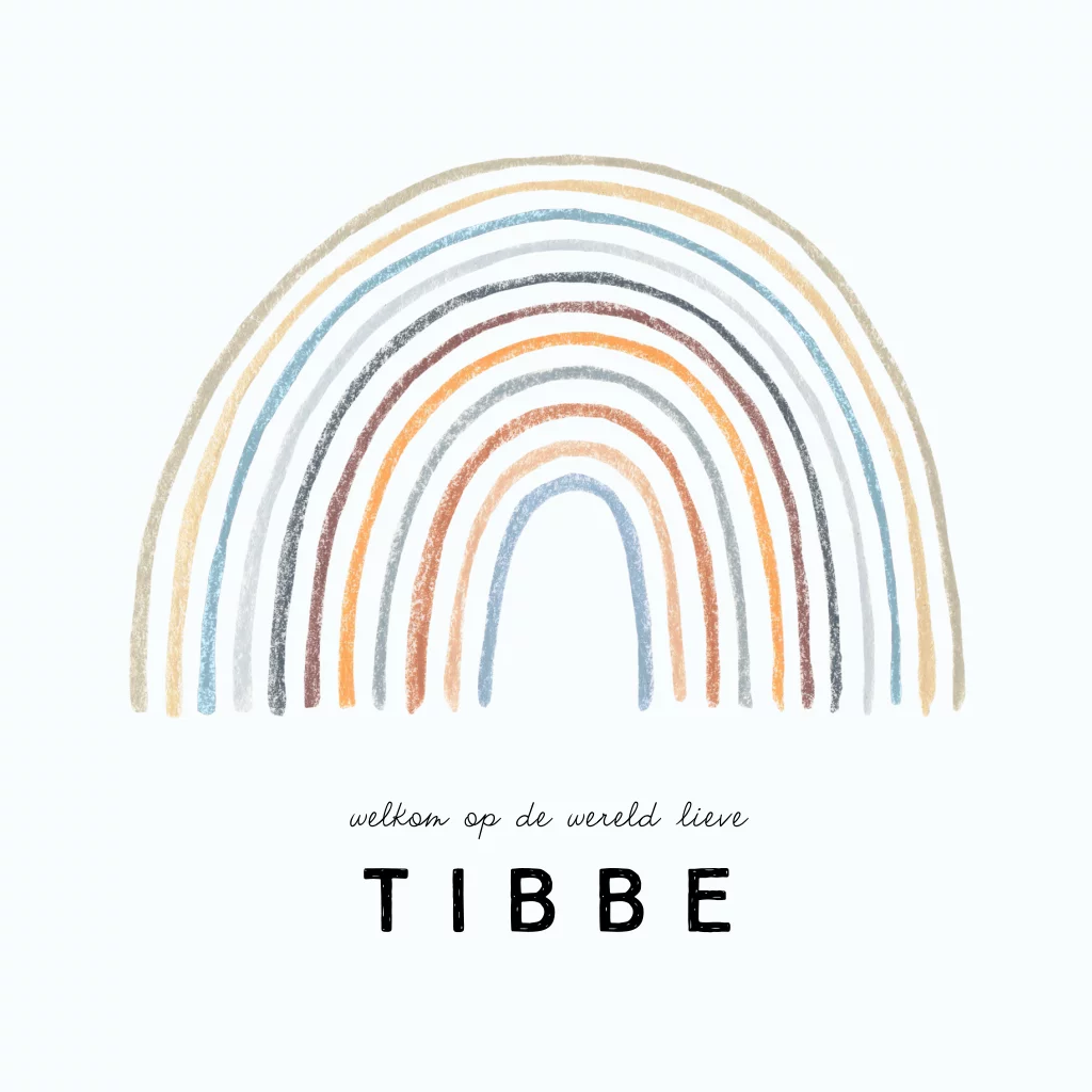 Lief en hip geboortekaartje met een getekende regenboog in heel veel mooie kleuren tegen een lichtblauwe achtergrond.