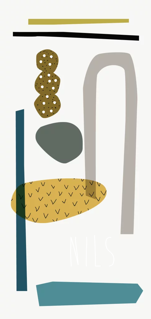 Hip geboortekaartje met retro grafische vormen en goudfolie.