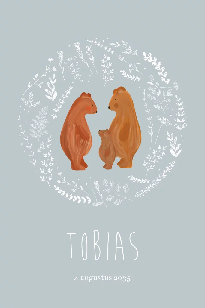 Lief geboortekaartje met een berenfamilie, een kleine beer en twee grote beren.