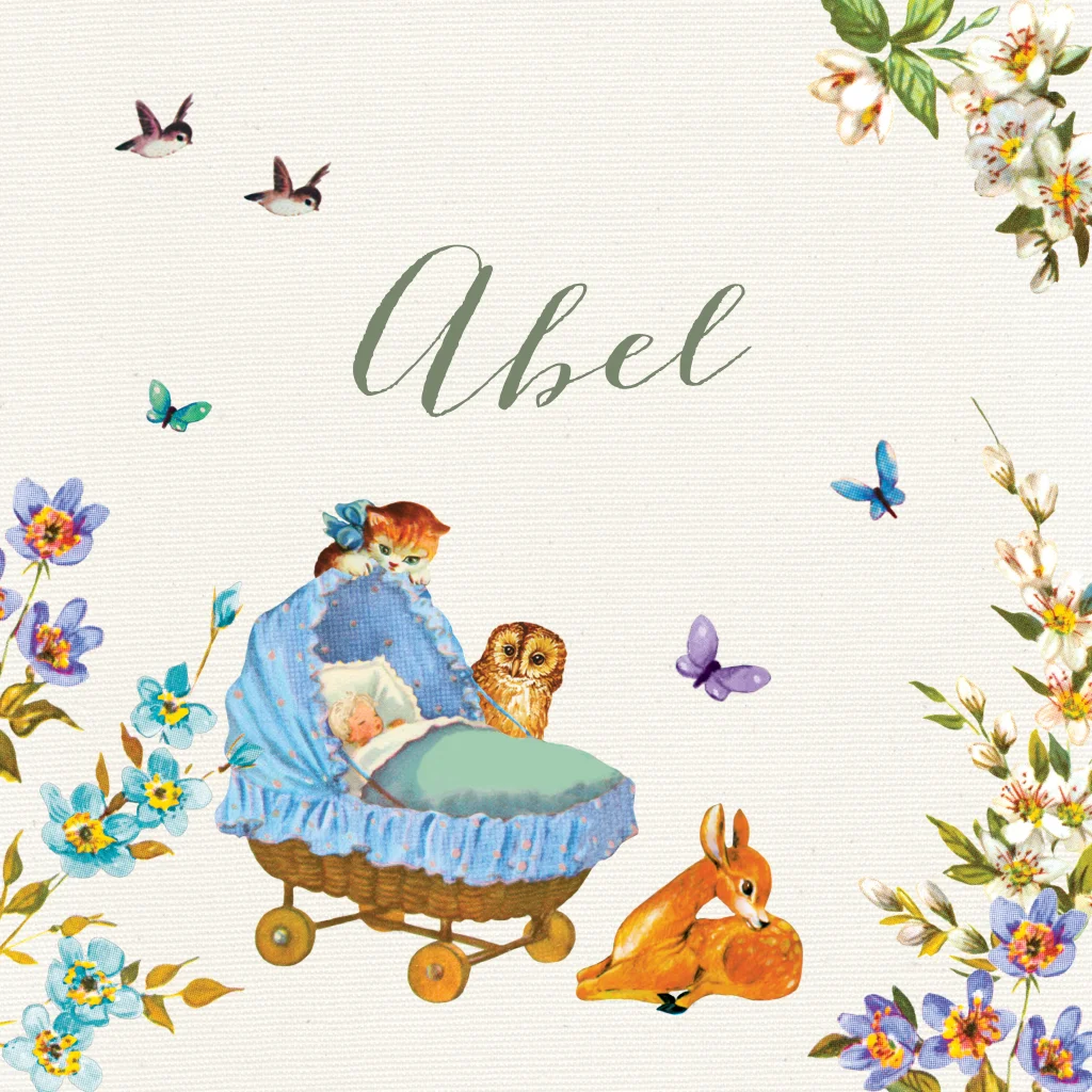 Retro geboortekaartje met wiegje, dieren en bloemen