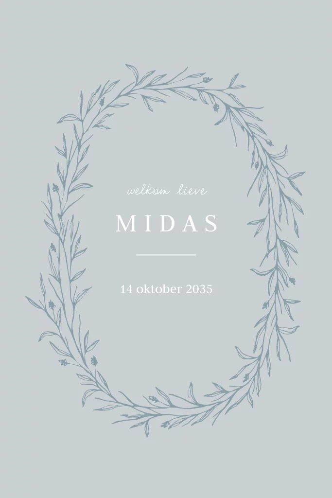 Klassiek geboortekaartje met krans van bladeren en grijze achtergrond.