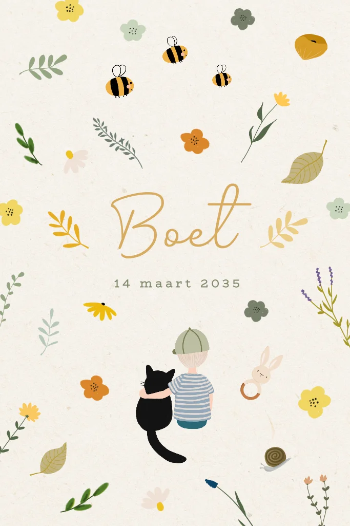 Lief staand enkel lente geboortekaartje met bloemen, een bijtring, beestjes en een jongen met een kat. De kleuren zijn natuurlijk en vrolijk, met veel groen en geel.