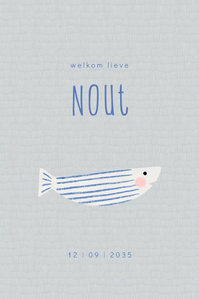 Een leuk geboortekaartje met een vrolijke vis. Dit kaartje heeft ronde hoeken en je kunt het eenvoudig naar je eigen wensen aanpassen in de editor door bijvoorbeeld het lettertype of de kleuren aan te passen.