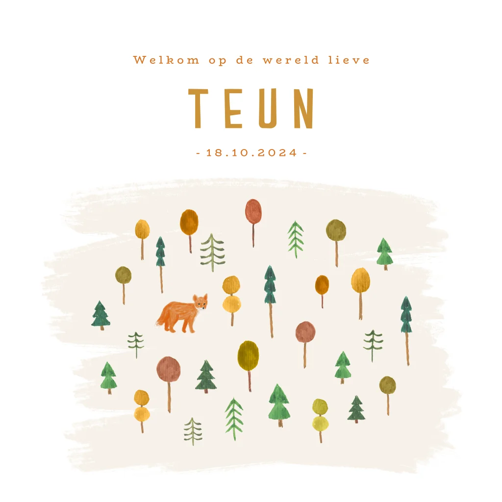 Lief enkel vierkant geboortekaartje met bomen en vosje.