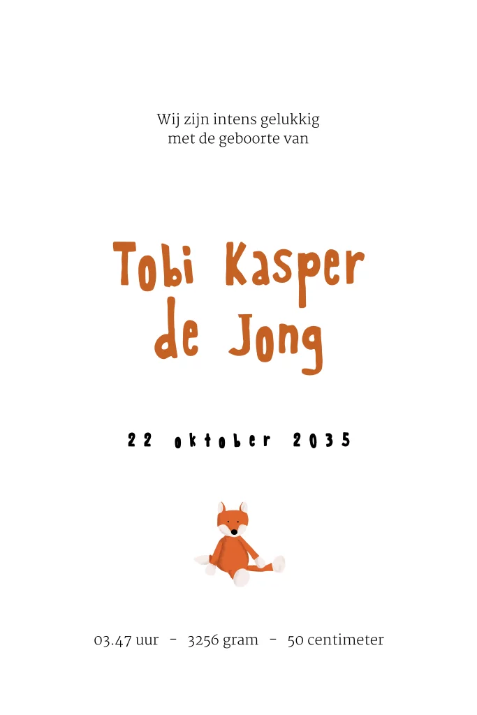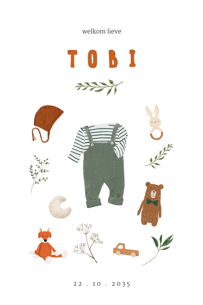 Lief geboortekaartje met speelgoed, takjes en kleding voor een klein baby jongetje.