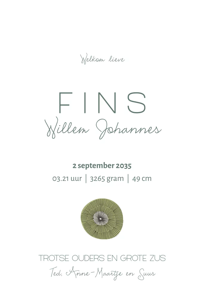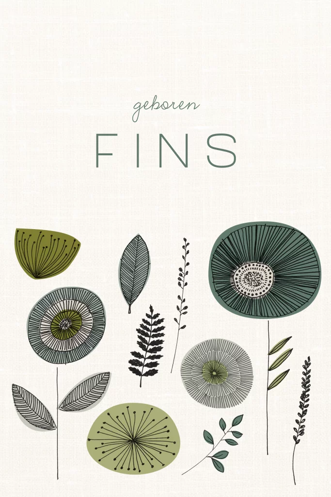 Lief geboortekaartje met groene retro bloemen. De bloemen zijn met de hand getekend. Dit kaartje heeft ronde hoeken.