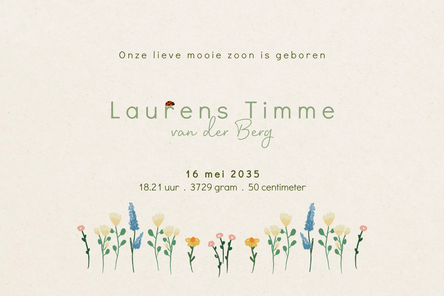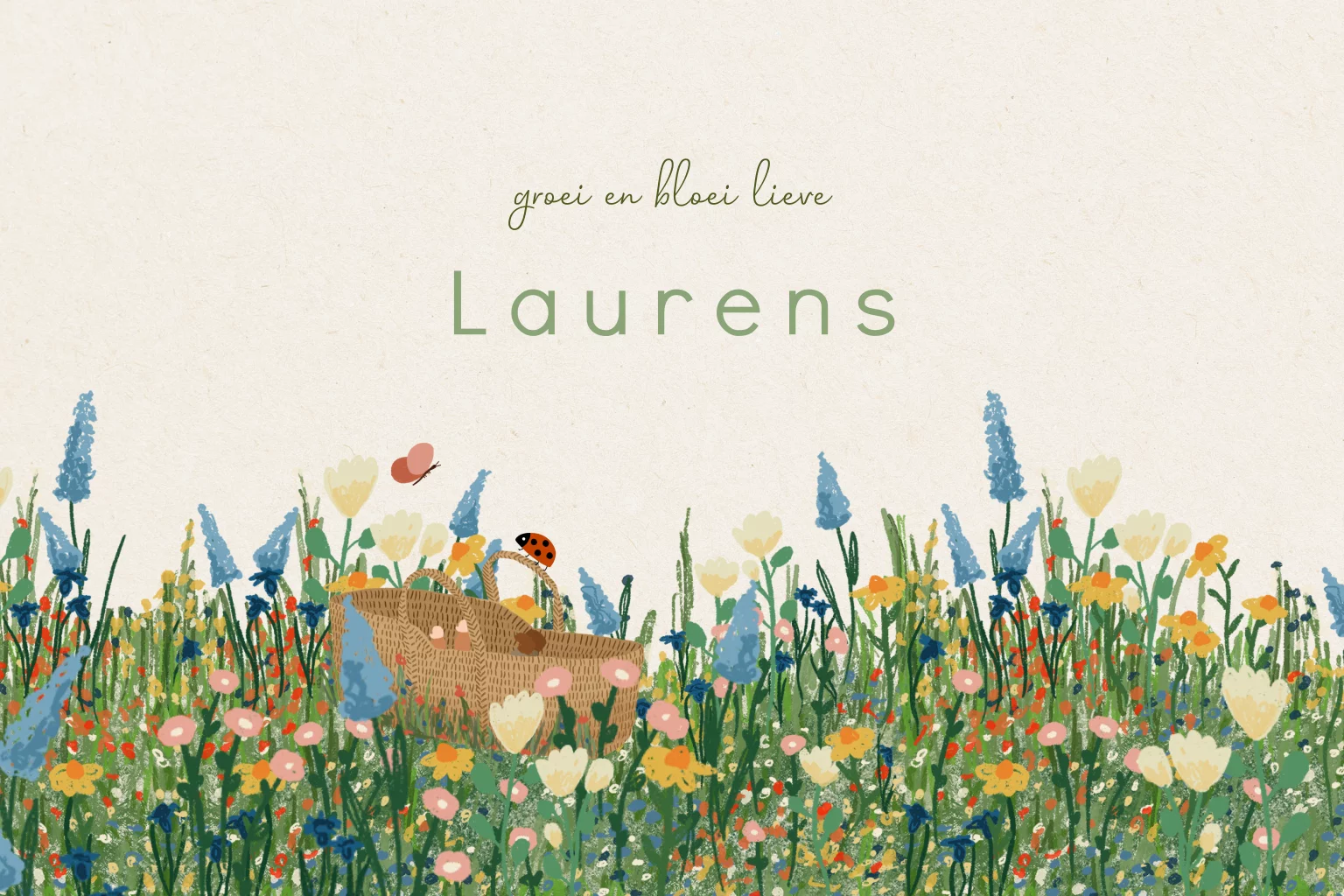 Dit dubbele liggende geboortekaartje met een bloemenveld is werkelijk een kleurrijke eyecatcher. Met een betoverend bloemenveld vol wilde zomerbloemen, een lief reiswiegje met een schattig baby'tje, een speels lieveheersbeestje en een elegante vlinder, straalt dit kaartje warmte en vreugde uit.