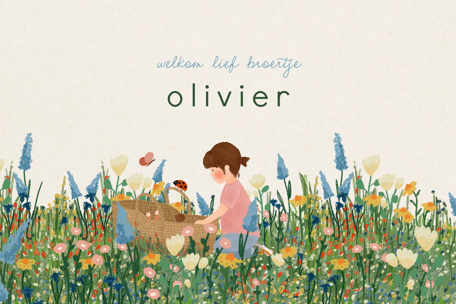 Op zoek naar een uniek geboortekaartje met een betoverend bloemenveld en een trotse grote zus die haar kleine broertje bewondert? Zoek niet verder! Ons liggende geboortekaartje met een bloemenveld en grote zus is een ware eyecatcher. Met een prachtig bloemenveld vol wilde zomerbloemen, een schattig baby'tje in een lief reiswiegje, een speels lieveheersbeestje en een elegante vlinder straalt dit kaartje warmte en vreugde uit.