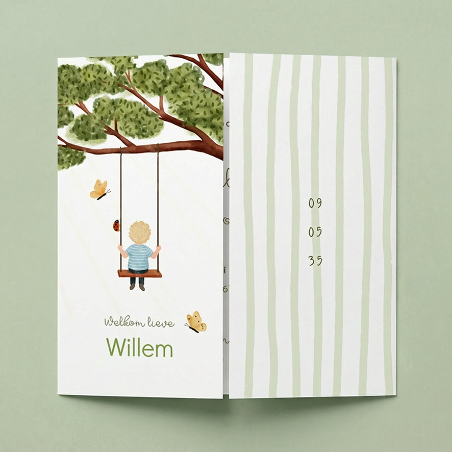 Geboortekaartje met een luikvouw van een jongetje op een schommel die aan een boom hangt. De zon schijnt, er fladderen vinders door de lucht en er is een lieveheersbeestje.