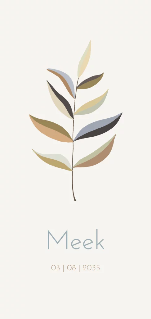 Modern langwerpig geboortekaartje met een takje in meerdere kleuren en een heel licht beige achtergrond.
